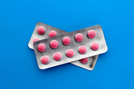 Medicine pills on a light background. Medicines and prescription pills flat lay background. Blue and pink medical tablets in blister.
