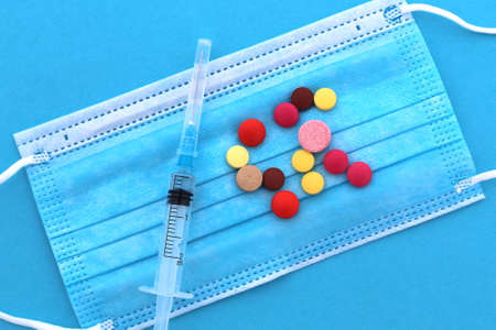 Pills and breathing mask as a concept of coronavirus. Facial protective mask, pills and pills, syringe with vaccine on a blue background. Copyspace, flat lay.