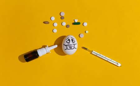 The egg face in a medical mask, pills and thermometer on yellow bright background. Covid-19 pandemic. top view