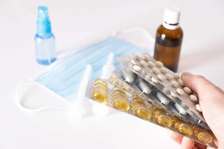 on a white background lie a mask, syringes and an antiseptic, in a hand packed different pills