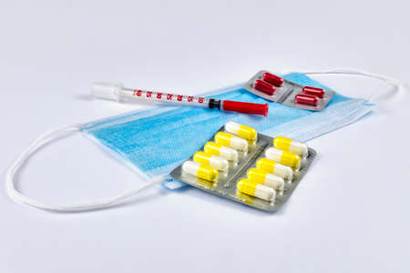 Expendable syringe, packaging with pills and protective face mask. Vaccination concept against various infection and other diseases. Healthcare and medicine.