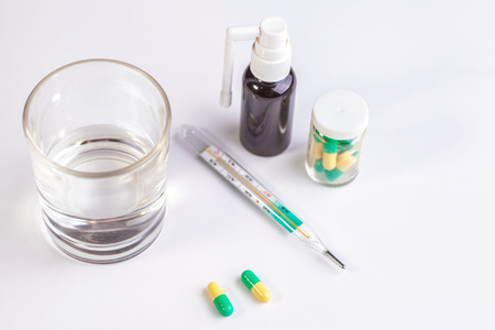 Tablets, a glass of pure water, a thermometer. On a white background.
