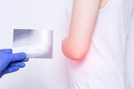 A patient girl who has an elbow ache at a doctor s appointment with a medical bursitis examination of the elbow, close-up, tunnel ulnar syndrome, neuritis