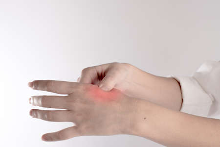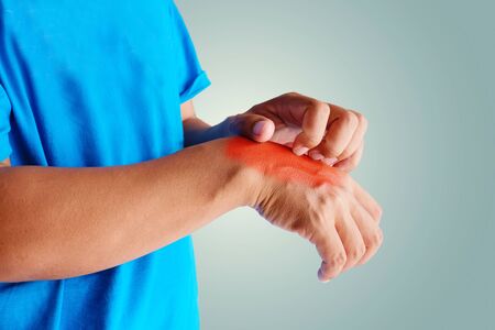 Health care concept. Itching of skin diseases in men using the hand-scratching. Red around the Itching area.