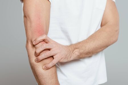 Cropped view of man touching hand with allergy isolated on grey