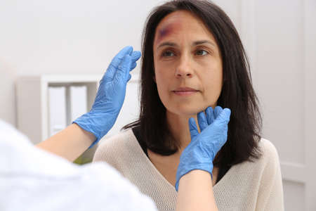 Doctor examining woman with bruise on forehead in clinic