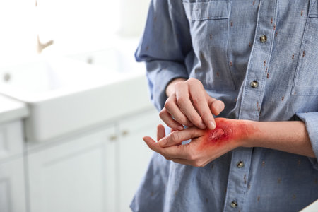 Woman with burn on her forearm indoors, closeup