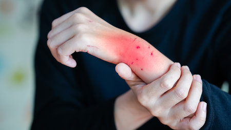person is showing red, irritated arm with visible marks, indicating possible allergic reaction or skin condition. expression conveys discomfort and concern.