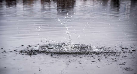 Drops of rain fall into the water, selective focus close up