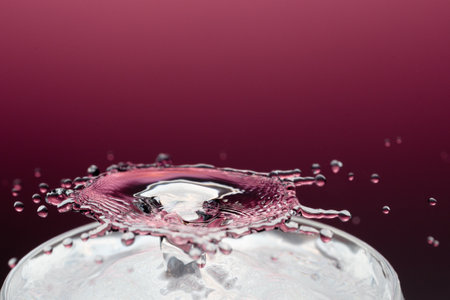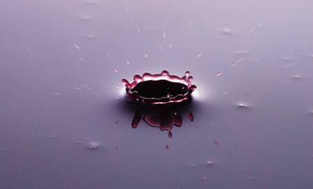 A red drop drips into the water and creates splashes of different shapes, due to the splashes waves are created on the water, the concept of a liquid splash, the substance is painted pink