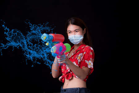 Portrait cheerful young asian woman holding plastic water gun Smiling and having fun playing in the water Songkran festival, Thailand. isolated on black background. Thai New Year's Day.