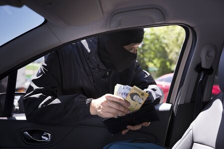 Undercover thief. Portrait of a young man stealing a handbag with money from inside a car on the street