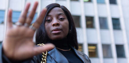 Confident black woman protesting against racial discrimination isolated on urban background - Young diverse african woman showing black lives matter gesture - stop racism, human rights concept