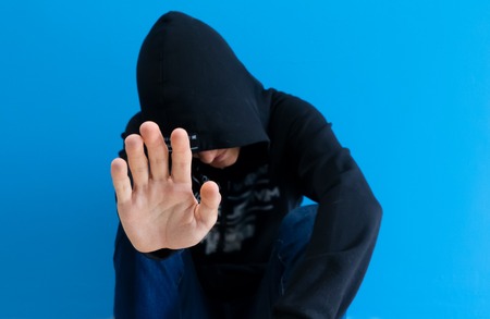 Silhouette of man in the hood or hooligan over dark background with copy space