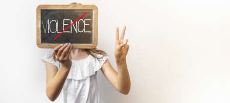 AGAINST VIOLENCE - Young girl with school blackboard with the word VIOLENCE shows peace sign (victory hand symbol) with her hand and fingers, isolated on white background banner panorama