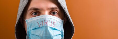 Portrait of a man in hood on his head wearing medical mask with virus word at brown background. Coronavirus concept. Respiratory protection concept.
