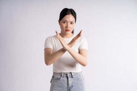 Beautiful young Asian woman say no on white background