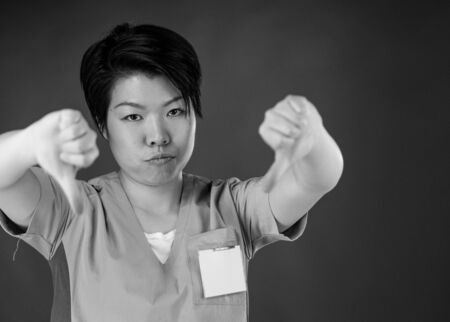 Dissatisfied asian girl show thumbs down gesture