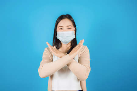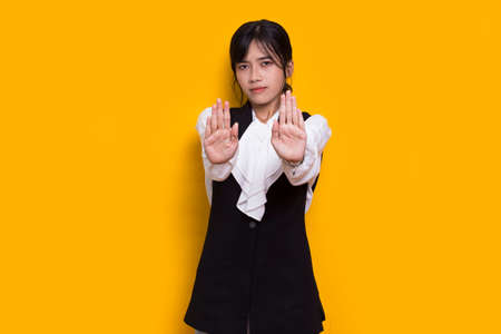 young asian woman making stop gesture with her hands isolated on white background