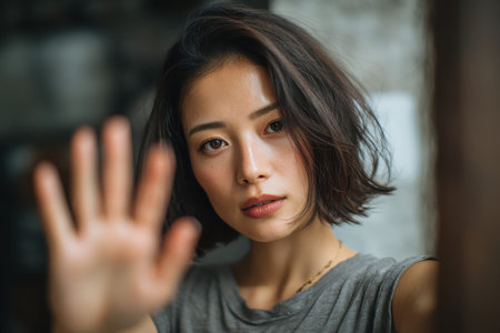 Beautiful young Asian woman reaching out with her hand in a cozy indoor setting during the afternoon light, expressing a moment of connection and serenity