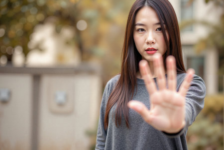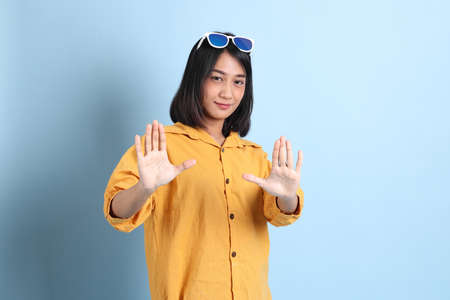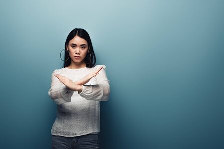 upset brunette asian woman showing stop gesture on blue background