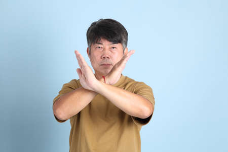 Asian man on isolated white background making NO gesture