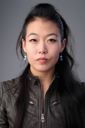 Face of beautiful Asian rebellious woman with leather jacket