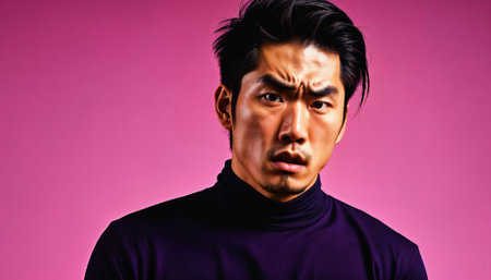 photo of asian man as a mafia gang member standing against pink background, generative AI