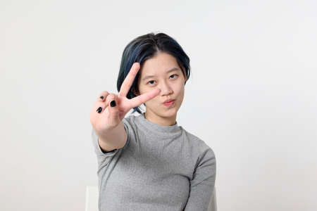 Young attractive Asian chinese malay woman pose face body expression mode emotion on white background v finger in front of face