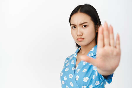 Close up of serious asian woman stretch out hand and say no, stop something bad, prohibit action, standing in blue dress against white background