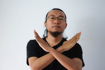 Asian male expressing strong disagreement using crossed arm gesture in studio