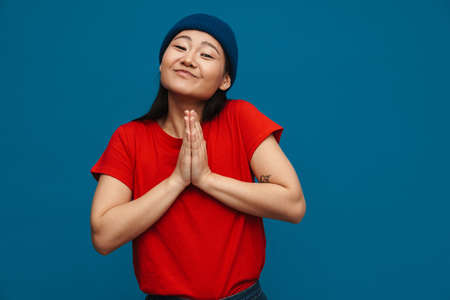Asian teen girl in hat holding palms together and smiling isolated over blue background