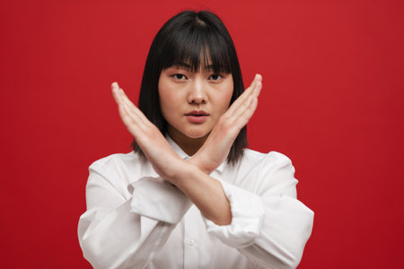 Portrait of a serious Asian woman crossing her arms in an X shape to express refusal, protest, or strong disapproval, on a neutral background.