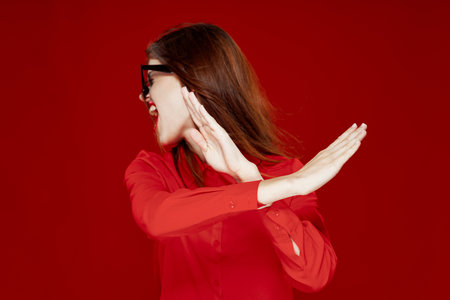 emotional woman in red shirt gestures with her hands