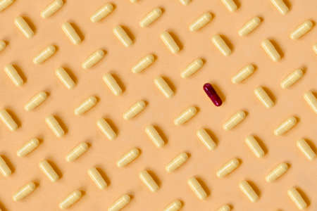 Fashion pattern made with yellow pharmaceutical medicine pills on pastel color orange background. The pattern it is broken with a red pill. Medicine creative concepts. Trendy colors