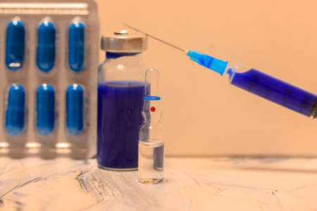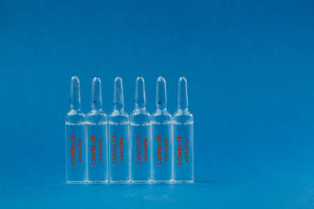 Medicine in an ampoule on a blue background. On ampoules written Coronavirus vaccine. Pandemic risk.