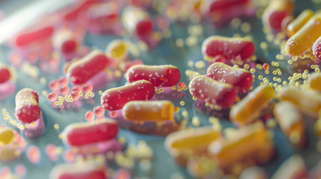 An illustration of a floor filled with colorful pills.. Created with Generative AI technology