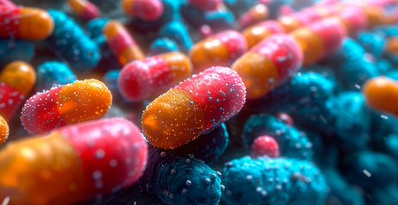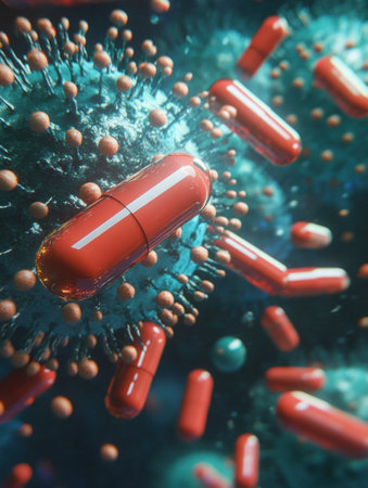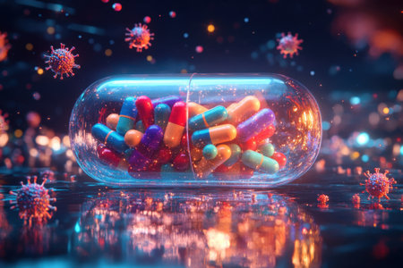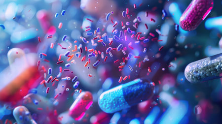 Pills are shown encircling and attacking bacteria, symbolizing breakthroughs in medical science aimed at combating infections effectively.