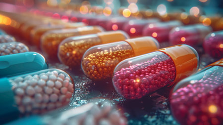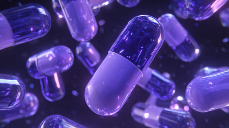 Purple capsules drift through a vibrant background, illustrating the intersection of modern medicine and science in a dynamic and visually engaging way.