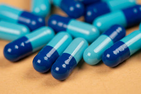 Blue and white capsules and orange whith white capsule pill on blue background. Global healthcare concept. Antibiotics drug resistance. Pharmaceutical industry.