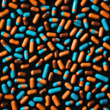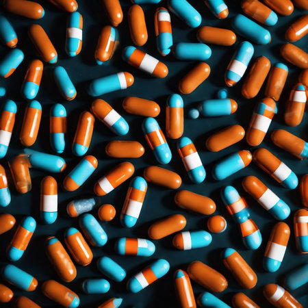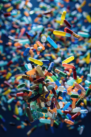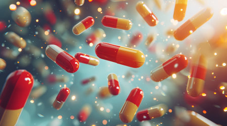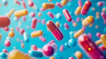 Colorful pharmaceutical pills tumbling in an abstract space, symbolizing medication use