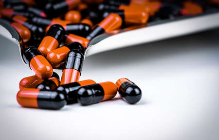 Pile of orange-black capsule pills. Antibiotics resistance. Drug use with reasonable. Global healthcare concept. Antibiotics drug resistance. Antimicrobial capsule pills. Pharmaceutical industry.