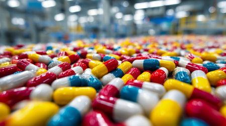 Vibrant capsules in varied hues densely blanket a surface within a sleek, airy pharmaceutical plant, highlighting precision and cleanliness in modern medicine manufacturing.