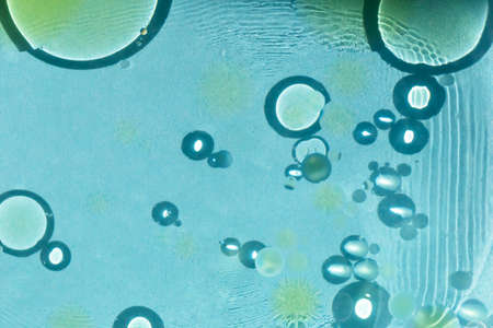 Yellow oil stains on blue water. Circles on the water on a light blue background. Magic and space. A solution for any design. Selective focus, defocus