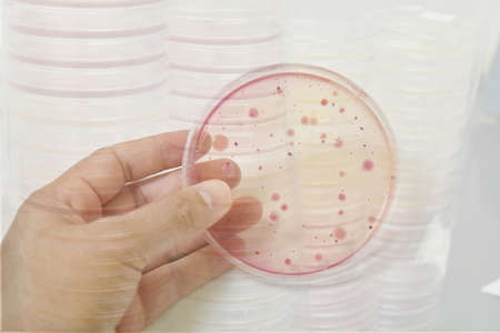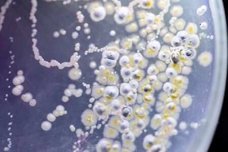 Colonies of bacteria growth on agar plate medium in microbiology laboratory.
