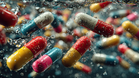 Dozens of colorful capsules and fresh water droplets colliding mid-flight, futuristic medicine vibe