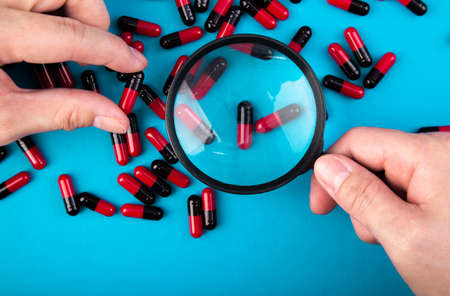 hand with a magnifying glass looking at pills. Medicine experimentl conceptual