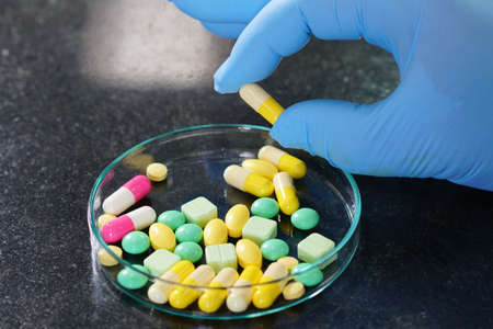 colorful pills, tablets in hand in a medical glove. Drug protection, treatment of viruses, antiviral, diseases concept.