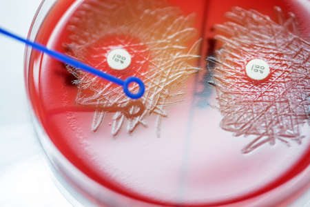 subsensitivity test on blood agar plate contains small light grains for Streptococcus spp. Focus on all agar surface.