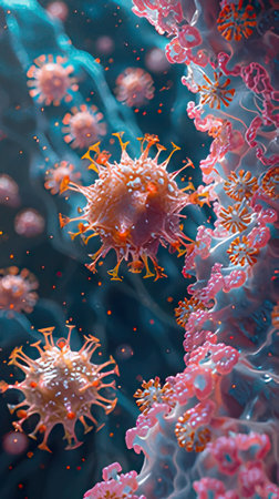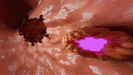 Covid 19 virus stuck on trachea lining (surface) - closeup view 3d illustration